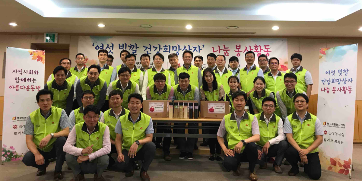 신세계건설은 회사 인근 사회복지시설을 통해 지역사회에 도움이 되고자 지속적인 봉사활동을 진행하고 있습니다. 서울시 중구자원봉사센터와의 협약을 맺은 당사는 관내 독거노인 어르신들 반찬 만들기, 경로당 정화활동 등 취약계층 지원을 통해 어려움을 겪고 있는 지역주민에게 조금이나마 보탬이 되고자 노력하고 있습니다.